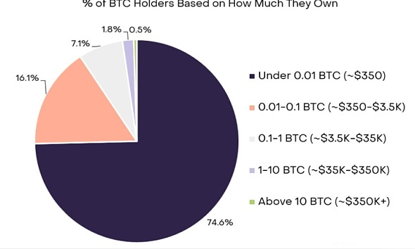 绝大多数比特币持有者都是小投资者,因为截至 2023 年 11 月 6 日,大约 74% 的比特币地址持有不到 0.01 BTC,价值约为 350 美元,如下图 1 所示。 与其他历史上高风险、高回报的资产(如私募股权和风险投资)相比,这些资产仅适用于经过认可的投资者,而比特币可供全球散户受众(可以访问互联网)使用。 因此,比特币的所有权结构反映了比特币技术的去**化、开源性质。 事实上,只有 2.3% 的比特币所有者拥有1个比特币或更多(截至 2023 年 11 月 6 日,每个比特币价值约为 3.5 万美元)。