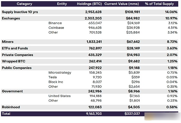 比特币的持有者包括从交易所到上市公司再到主要政府的各种机构。尽管这些群体的一些成员可能与其他成员有重叠,但大约40%的比特币总供应可以归因于可识别的所有权群体,如交易所、政府实体、上市公司和私人公司(例如,特斯拉和Block Inc.)、确保比特币网络安全的挖矿公司、ETF和其他上市基金、封装的比特币、消费者交易平台(例如,Robinhood)以及休眠地址。下面列举了这些群体。