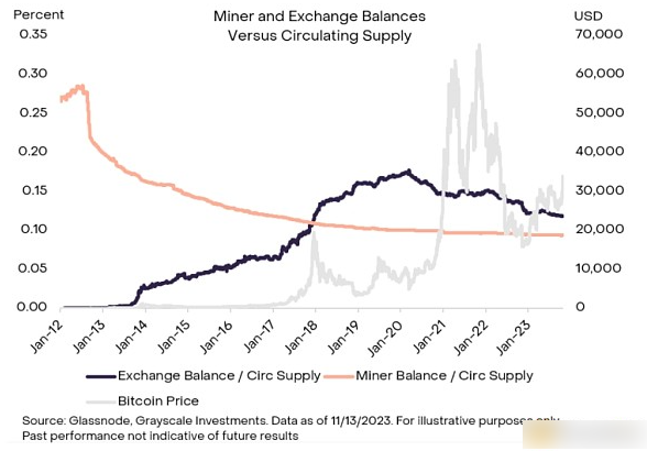 与此同时,在这些与需求相关的不利因素中,比特币的供应仍然受到明显限制。 非流动性和长期持有者的供应量已飙升至前所未有的水平,而短期供应量已降至**水平。 如果这些趋势持续下去,灰度研究团队预计,比特币所有权的动态可能会日益放大宏观事件的影响,例如不断变化的全球政策和监管(例如,美国现货比特币 ETF 的批准)以及加密货币市场的发展,例如 2024 年比特币减半。