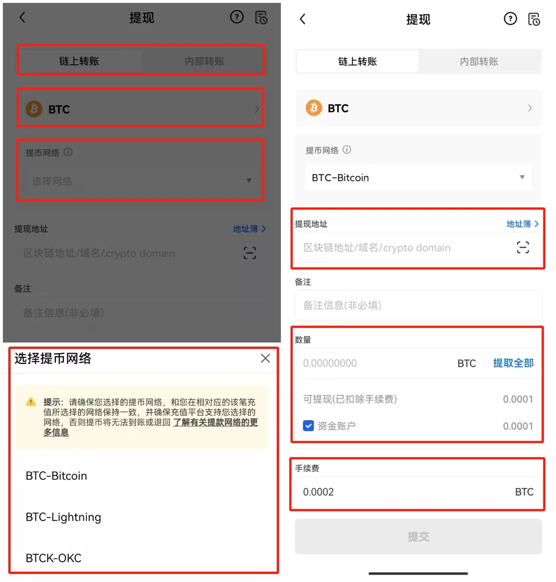 !注:选择提现网络时,要与其他交易所或钱包【充值/充币网络】保持一致,例如都为BTC-Bitcoin,以免造成资产丢失。