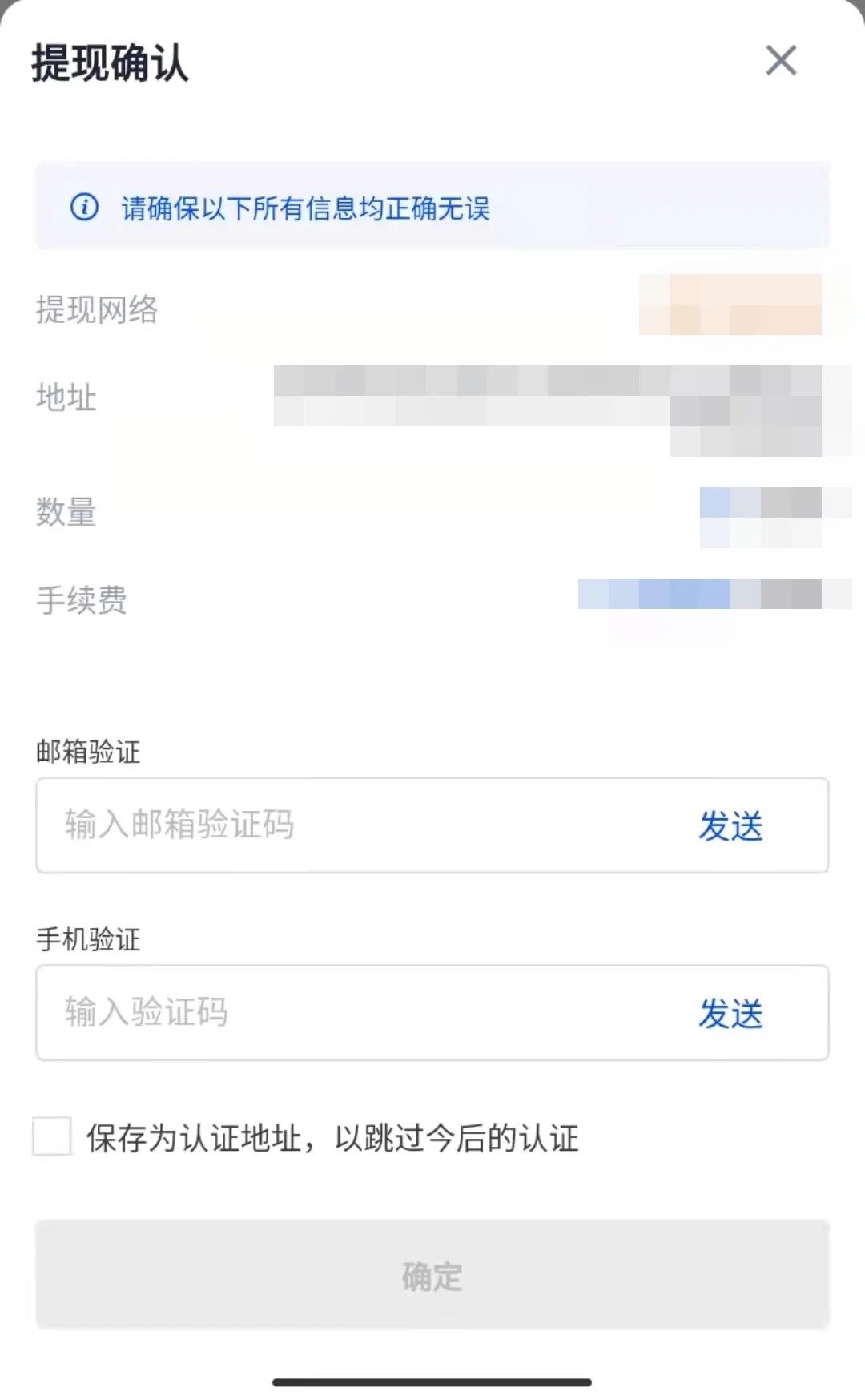 4. 点击提交后若地址并未保存为认证地址,则需要进行提现二次确认,需要邮箱验证/手机验证,点击确定后提币申请就提交成功了。