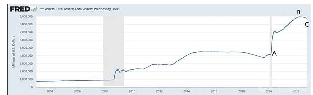 美联储的主要任务包括控制通胀和保证就业,为缓解疫情对经济和就业的冲击,美联储在20年3月开启了量化宽松的印钞模式,水龙头进水的阀门打开,注入巨量的水源推升了水位,资产价格的飙升带来了包括美股、数字货币等全球金融市场的牛市,商品价格的水涨船高也带来了高通货**率。在下图A—B点,美联储总资产规模持续攀升,BTC也迎来了3800-69000美元的牛市。