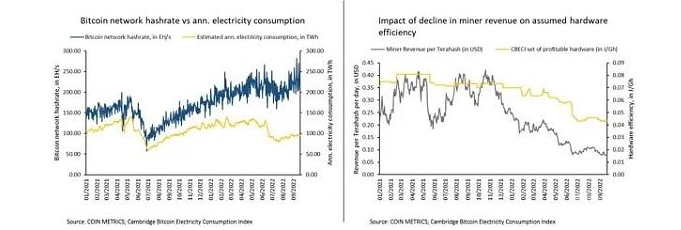 但是,为什么温室气体估计排放量会突然下降?简而言之,尽管哈希率保持相对不变,矿业盈利能力的大幅下降造成了耗电量的下降。乍一看,这个现象似乎是违反直觉的,所以让我们更深入地进行研究,并探索其背后的原因。图2 (RHS) 显示了矿工盈利能力下降对比特币矿工硬件选择的影响。关于 CBECI 方法的更**的描述可以在 CBECI 网站上找到。它基于这样一个假设:比特币矿工是理性的经济代理人,因此只会使用有利可图的硬件。