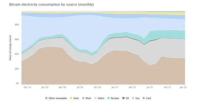 新工具还提供了比特币电力组合的更详细信息。观察2022 年 1 月发现,煤炭是**的单一能源,占 36.6% 的份额,水电是**的可持续能源,占 14.9% 的份额。总体而言,结果显示,化石燃料占总电力结构的近三分之二 (62.4%),可持续能源占 37.6%(其中 26.3% 是可再生能源,11.3% 是核能)。因此,研究结果明显偏离了行业对可持续能源在比特币电力组合中的份额为 59.5% 的预估。【6】