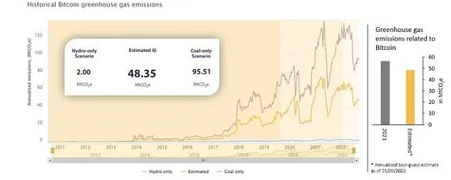 考虑到最近每单位算力的采矿收入急剧下降,矿工向更**硬件的转移,这导致(至少是暂时的)老式的、效率较低的硬件退役。这一假设似乎被比特币矿工的轶事证据证实了。【5】观察图 2 左边的图表,这种转变的影响变得更加明显。比较比特币网络哈希率的增长与2021 年 1 月 1 日至 2022 年 9 月 21 日期间估计的年耗电量,哈希率从 137.76 EH/s 提高到 242.13 EH/s ( 75.8%);用电量从 96.48 TWh 下降到 95.42 TWh (-1.1%)。**,采矿硬件效率的提高导致年温室气体排放估计量(截至 2022 年 9 月 21 日)远远低于 2021 年水平。