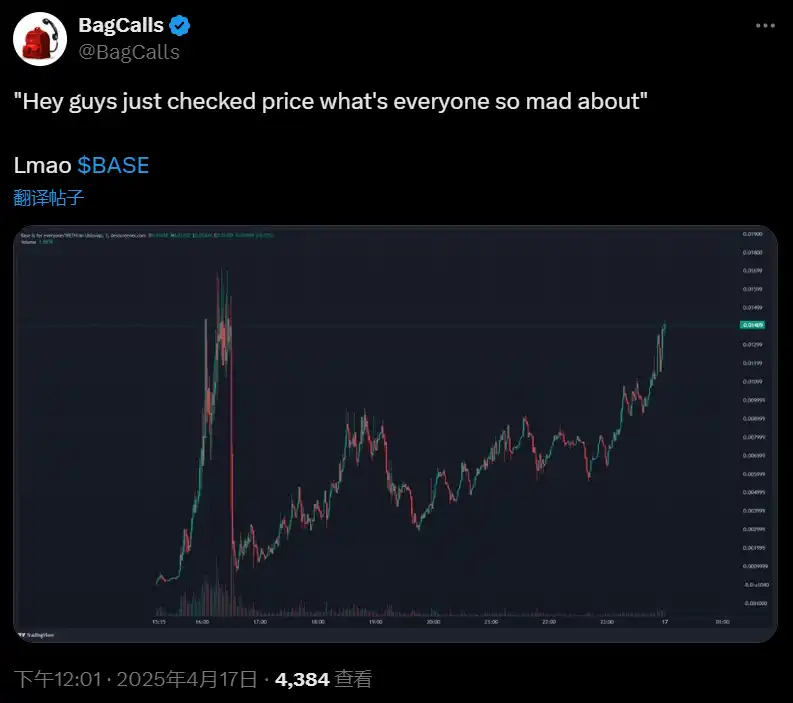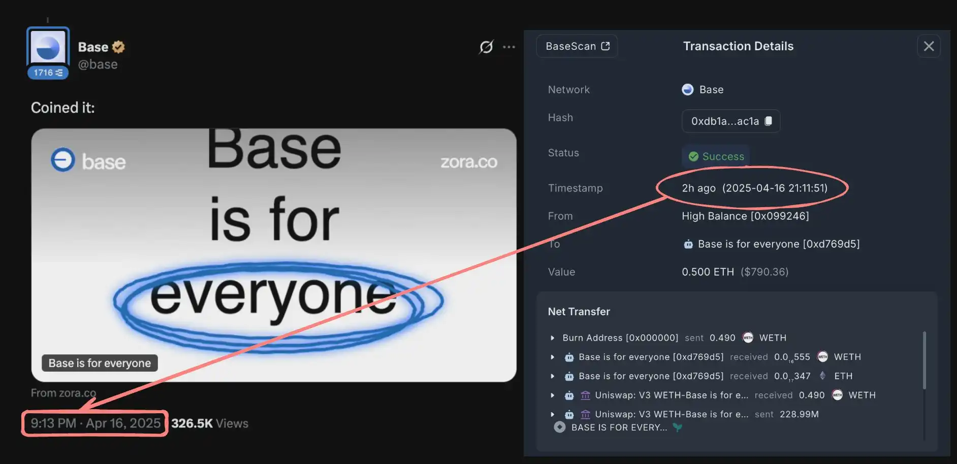 根据社区讨论,用户在经历了凌晨的价格暴跌和团队的混淆行为后,开始重新聚焦于原始的「Base is for everyone」**。用户@0XaYUSh__发帖描述了事件进程:「Base is for everyone」发布后 1 小时内达到 1600 万美元市值 -> 团队发布另一个 CA 导致 94% 下跌 -> 社区回流并决定推动原始** -> 再次 20 倍。这一描述也说明了社区在中午时段集体行动,支持原始**,导致**突破前高的原因。