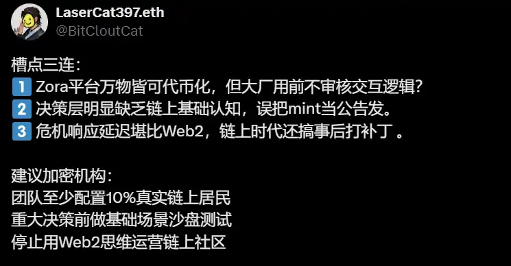 KOL 镭射猫在公开平台吐槽「Zora 平台万物皆可**化」、「决策层明显缺乏链上基础认知」以及「链上时代还搞事后打补丁」,并建议加密机构「团队至少配置 10% 真实链上居民,重大决策前做基础场景沙盘测试,以及停止用 Web2 思维运营链上社区」。