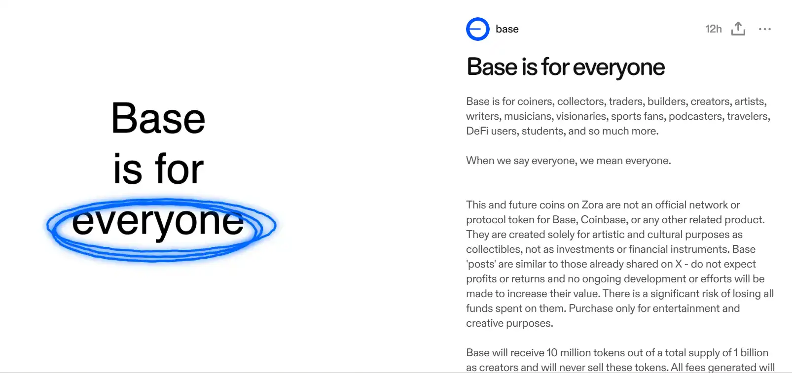 但这次反弹,是一次回光返照,还是说明「Base is for everyone」真的是一支正在形成社区共识的潜力股?根据 Zora 平台的描述,「Base is for everyone」**并非 Base 或 Coinbase 的官方**,而是通过 Zora 自动 token 化的内容,旨在作为艺术和文化收藏品而非投资工具。Base 明确表示,这些**不期望带来利润或回报,Base 也不会出售其持有的 1000 万**,所有手续费将用于支持 Base 上的开发者。Base 同时也在 X 上也声明:「这些不是 Base、Coinbase 或**相关产品的官方网络**。我们分享的内容是创造性的,我们将继续将文化带到链上」。这迹象都表明,「Base is for everyone」**的价值不依赖于 Base 的项目基础设施或长期发展计划,而是由社区兴趣和投机情绪驱动。
