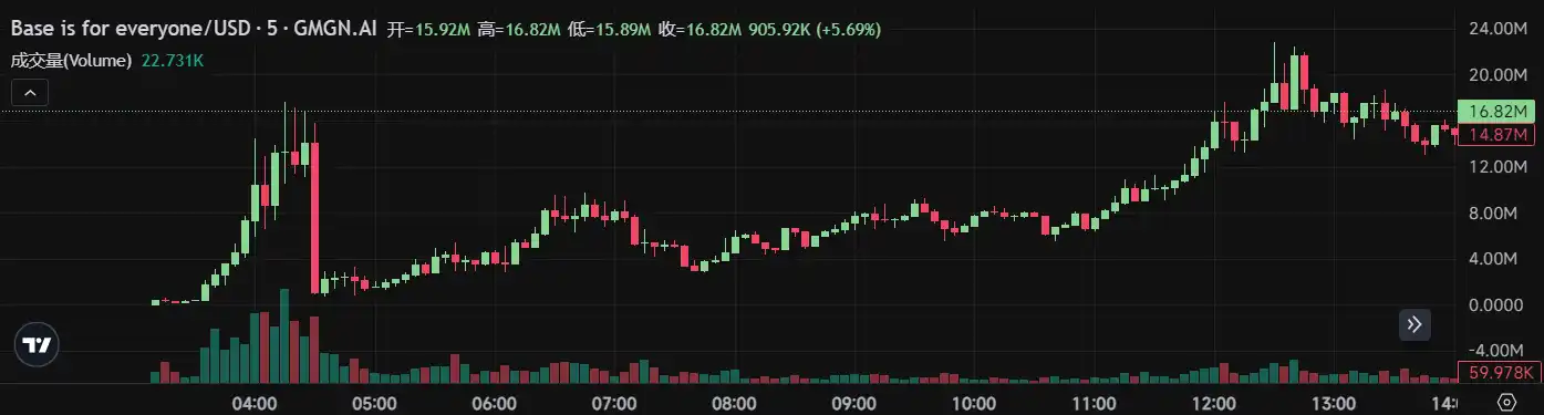 有趣的是,「Base is for everyone」并没有因为大暴跌就一蹶不振,而是一直**上涨,在 17 日午间突破前高达到了 2283 万美元的市值。