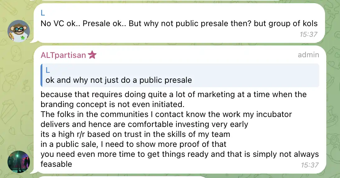 项目孵化的领头人 ALTpartisan 对此的回应是,因为需要在品牌概念尚未启动时进行大量市场营销,因此联系了彼此信任的社区在非常早期就进行投资。随后补充道「两个月前的市场看起来非常不确定,而项目需要 Runway。如果我们选择走 VC 路线,这个项目的起步市值将是 300 万美元,这也是我们为什么选择一个小型社区销售的原因。」