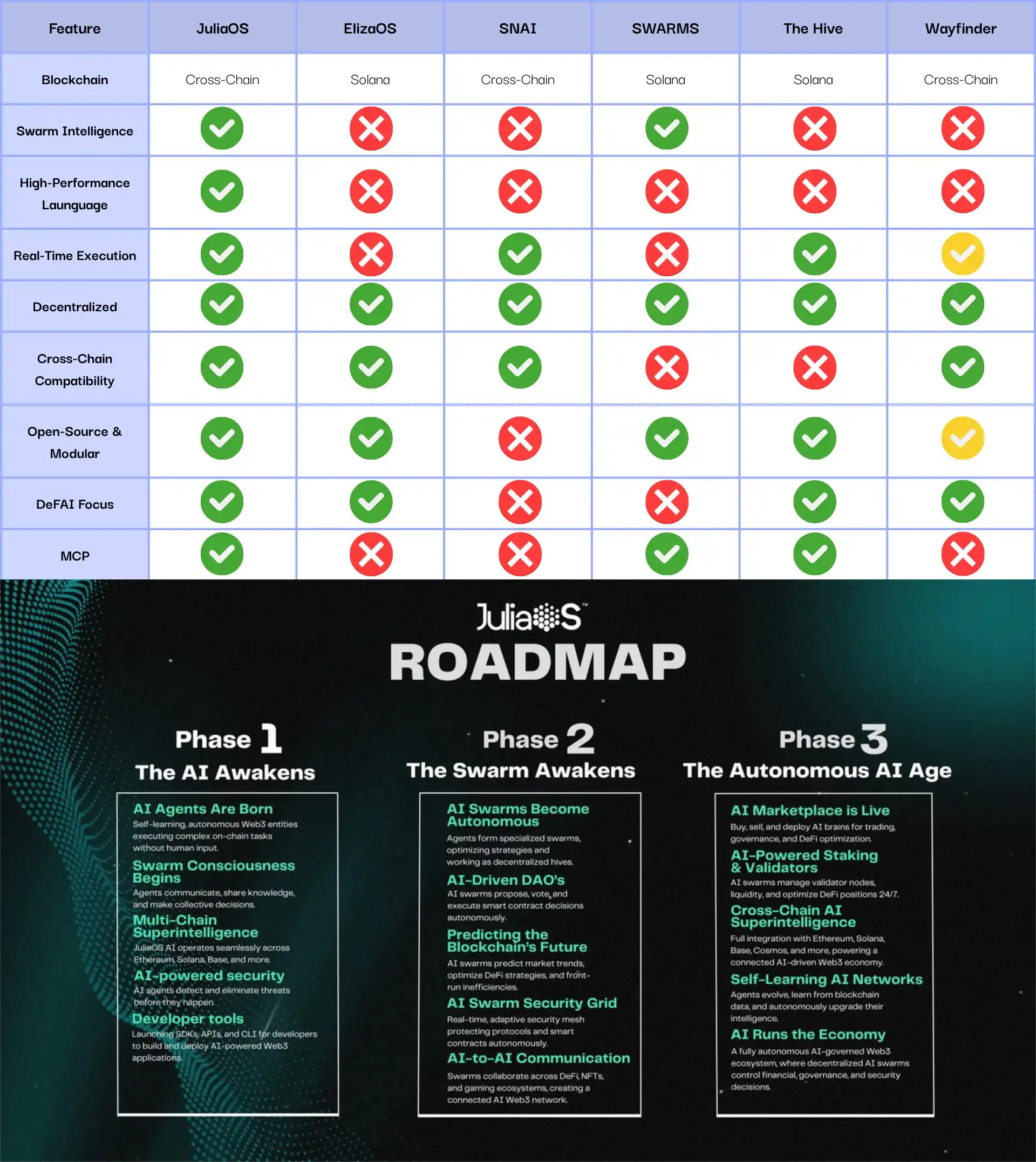 而项目路线图中表示,团队也将从 AI Agent 出发,发展成 AI 驱动的 DAO 组织并在未来上线可以交易 AI 学习资料和 AI Agent 的市场。该路线与大多的框架类 AI 项目相似,但此前大多 AI 项目并未达到预期。相反市场中最认可的概念其实是该项目使用的底层编程语言 Julia。