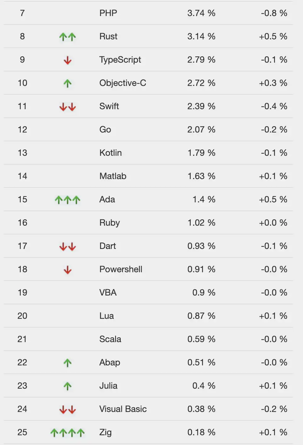 到现在 13 年过去了在 PYPL 的 2025 年 4 月编程语言流行度排名,其排名第 23,在 AI Agent 高速发展的现在,尤其在 CryptoAI 中,Julia 被认为其更适合 Crypto 的快速更新的信息流。