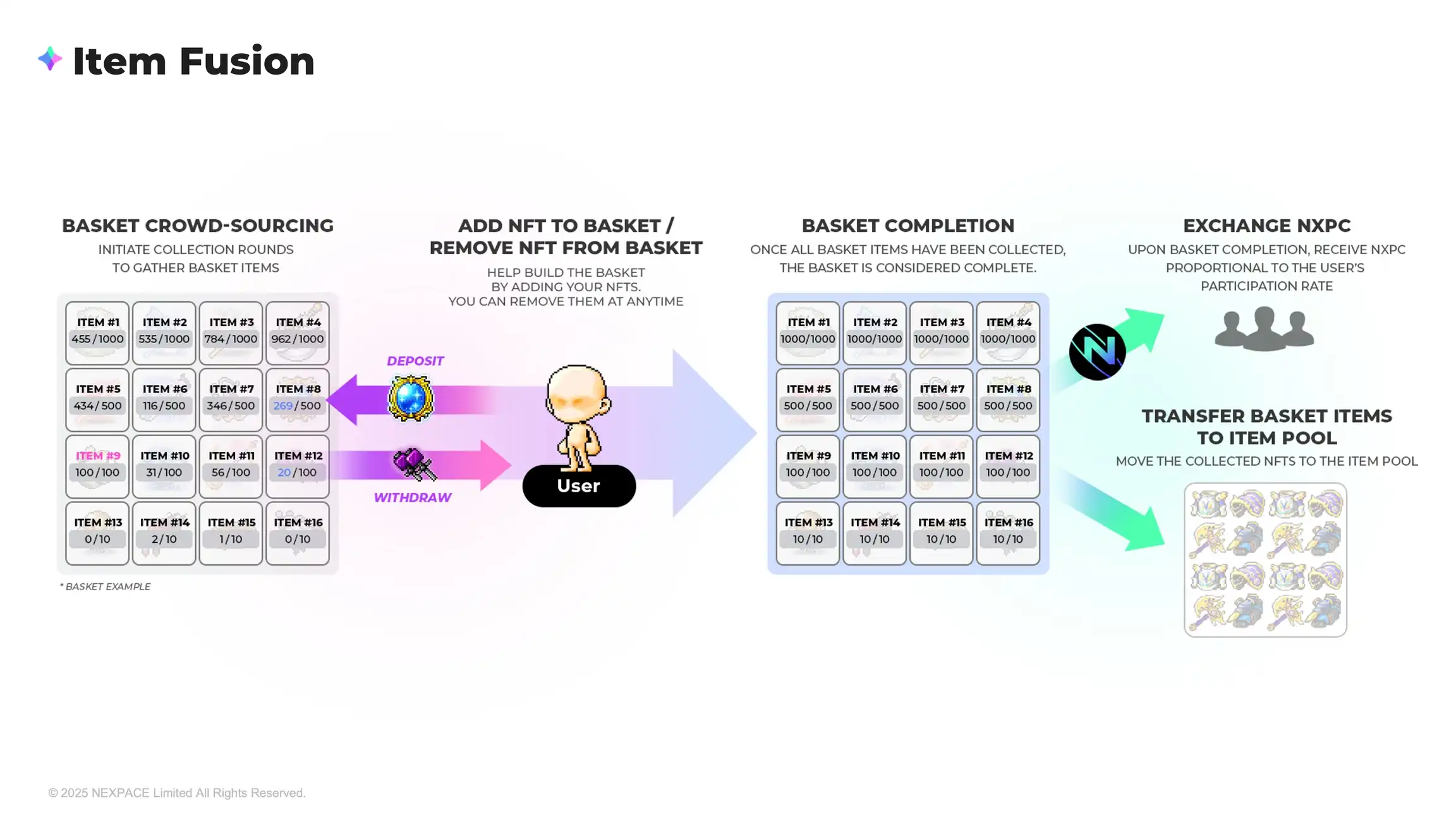 「$NXPC 裂变」机制是指玩家可以使用 $NXPC 兑换游戏道具(NFT)。这个机制很像是 FCFS(先到先得)抢购 NFT 的过程,玩家兑换到的不是某个特定的道具,而是「MSU 物品池」中剩余所有可用道具类型**供应量的固定百分比。