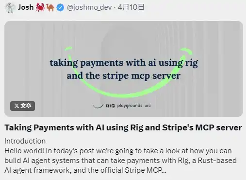 本周我与 arc 团队交流,得知代理型应用商店 Ryzone 即将上线,并完成与 MCP 系统的深度集成。值得关注的是,AI 智能体将能通过 Rig Complex 和 Stripe 的 MCP 服务器完成支付操作。值得强调的是,Stripe 平台去年处理的支付总额已达 1.4 万亿美元规模。