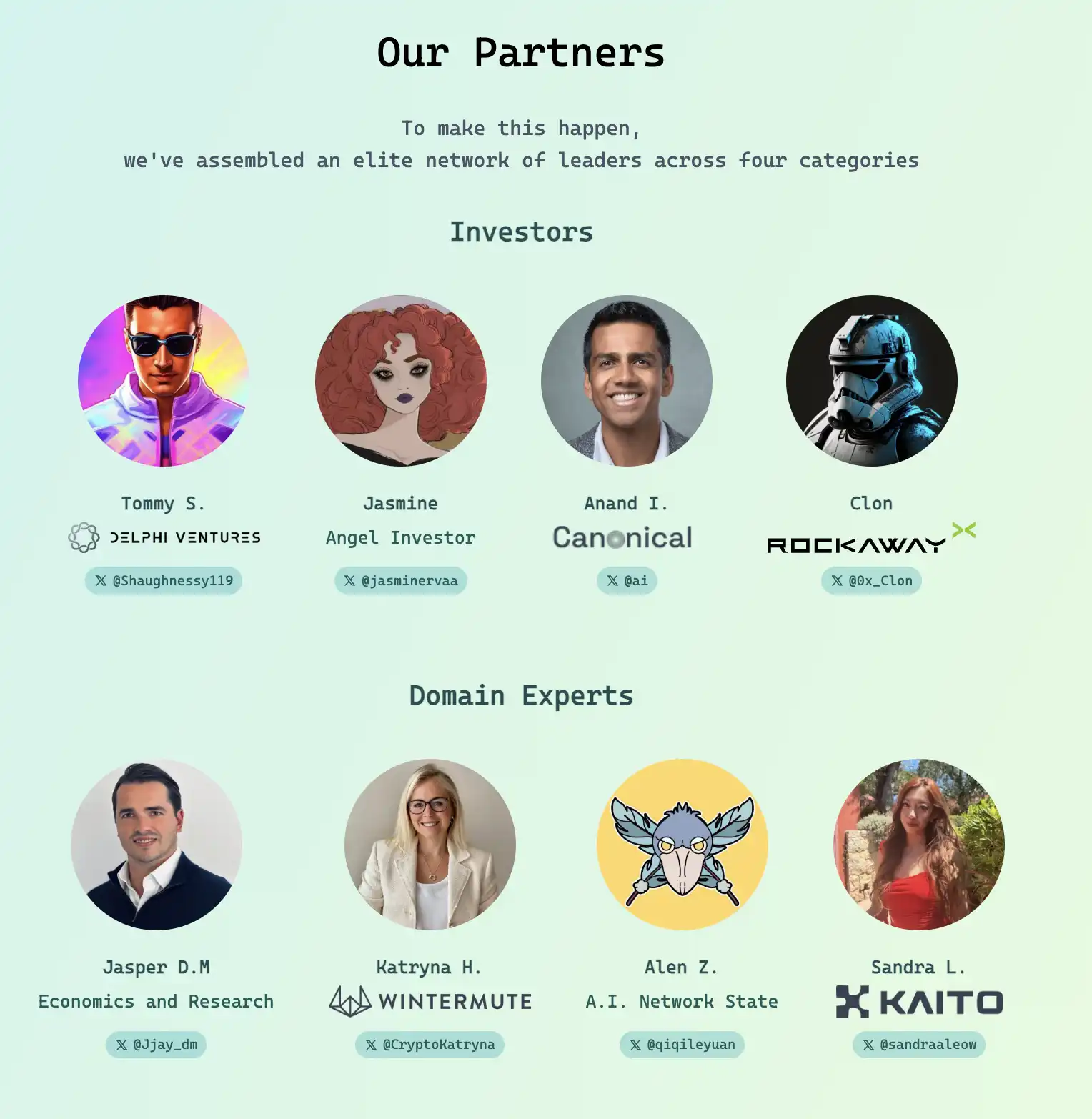 首先,Virtuals 完善了自己的项目方建设生态,发布了 VPN 计划「Virtuals Partners Network」,从一开始 Virtuals 的计划就是将更多的 AI 人从引入 Crypto,而该计划将多个生态位置相连接,包括投资人、各个领域专家、学者和开发者,几乎是只要你有一个想法,从投资人到做市商、市场营销甚至专业人才都可以从这个计划中获取资源。「一条龙服务式」的孵化器,可以说对**想要进入 Crypto 的人才跟 Virtuals 合作是**选择。