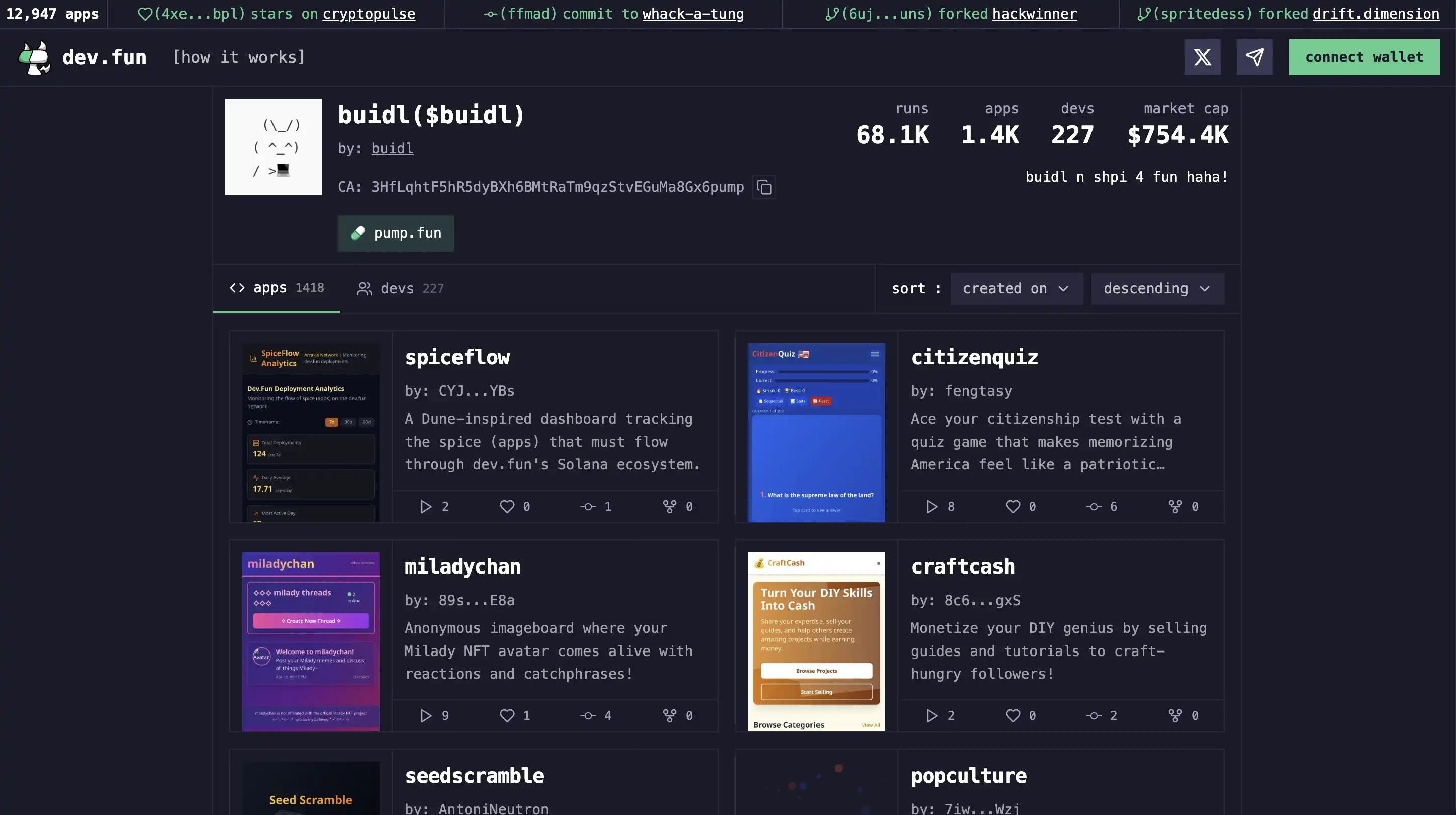 dev.fun 提供了通过与 AI 聊天便能生成 App 的功能「类似之前 YC 投资的 Replit」,而用户除了可以发行项目/Meme 的 Token,也可以自行选择交易对,当前拥有最多支持者的 Buidl 目前共有 1400 个 App 并运行了将近 7 万次。