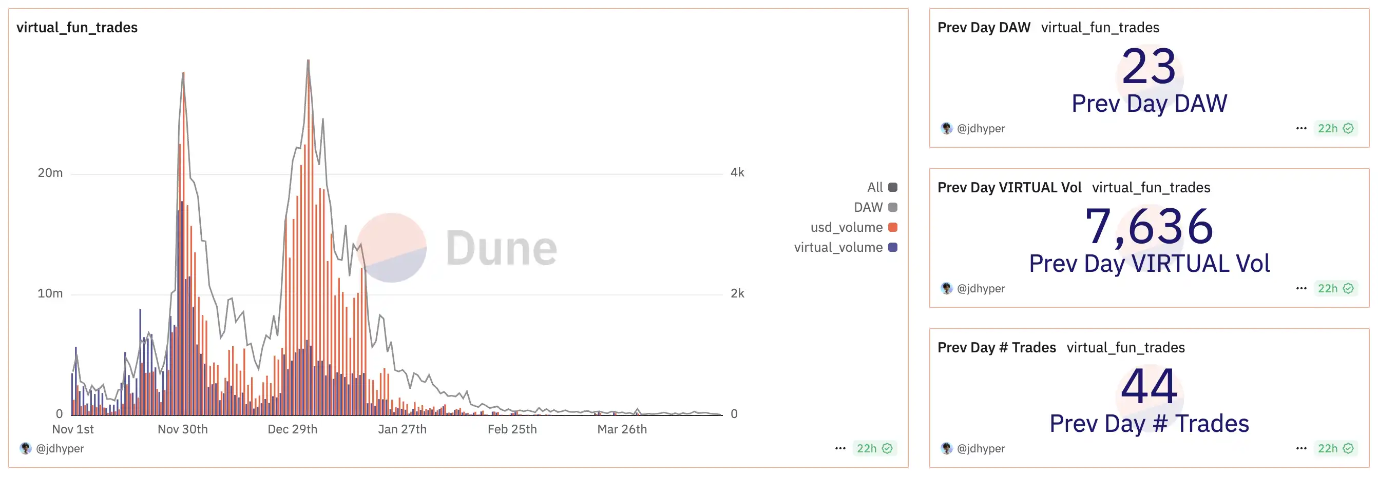 作为上个周期生态搭建与价值飞轮结合的最完善的 AI 项目之一,Virtuals Protocol 的币价随着市场的沉寂飞轮的旋转速度也放缓了,随之而来的是价值 45 亿美元市值的泡沫被戳破,跌幅超过了 90%,而发射器的参与者也大幅**。但 Virtuals 没有放弃,在这个 AI 的熊市,他们开始 Build,而如今 Virtuals 的市值已经回到了 10 亿美元的关口。