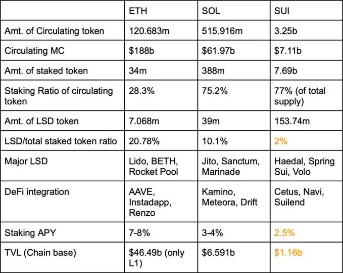 Sui 的流动质押衍生品市场的一个主要问题在于其质押年化收益率较低,约为 2.5%,而 Solana 的 APY 为 7-8%,以太坊的为 3-4%。