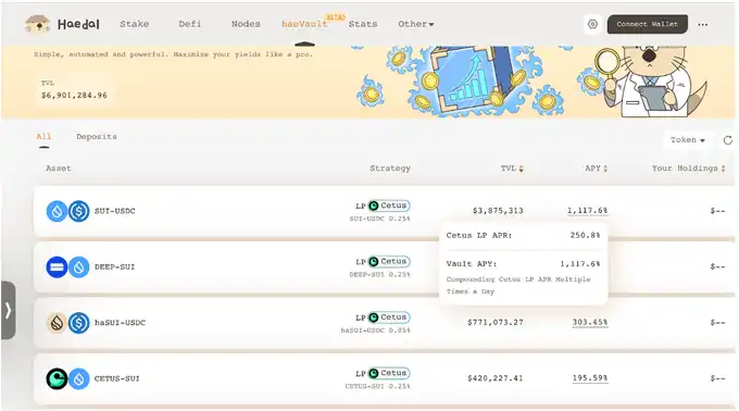 HAEDAL **的用例进一步巩固了其应用价值。将其锁定为 veToken,可参与 HaeDAO 治理,或用于提升金库的年化收益率。此外,潜在的空投机会(这在 Sui 生态系统中**常见)也为其增添了额外优势。