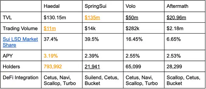 Haedal 的核心指标表现强劲:TVL 达 1.1736 亿美元(对比 Suilend 的 1.174 亿美元和 Volo 的 5000 万美元),日活跃钱包数超 44000 个,持有者数量达 79.4 万。当前,Haedal 在交易量、年化收益率和持有者规模三项关键指标上暂时处于**地位。