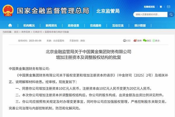 财经5月12日讯 日前,北京金融监管局公布相关批复,同意**黄金集团财务有限公司(简称“**黄金集团财务公司”增加注册资本10亿元人民币,注册资本由10亿元人民币变更为20亿元人民币。以下是相关批复正文:
