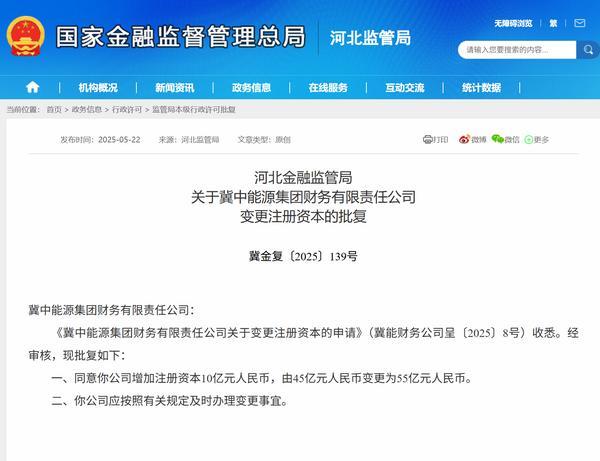 财经5月22日讯 今日,河北金融监管局发布相关批复,同意冀中能源集团财务有限责任公司(简称“冀中能源集团财务公司”增加注册资本10亿元人民币,由45亿元人民币变更为55亿元人民币。以下是相关批复正文: