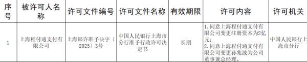 财经5月30日讯 **人民银行上海市分行非银行支付机构变更事项许可信息公示表显示,该分行同意上海程付通支付有限公司(下称“程付通”变更注册资本为2亿元;同意上海程付通支付有限公司变更孙兆波为公司董事兼总经理。