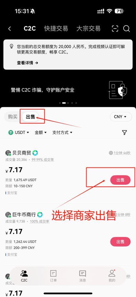 在出售前你得先把币转到资金账户。在“资产”里进入“划转”,从交易账户划转到资金账户,然后在c2c买币页面点击出售按钮,选择你想出售的商家。