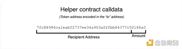 然而,我们可以假设大多数用户都在转移同样的几种 Token(WETH,Dai,USDC)。所以,从调用数据中删除整个 Token 地址的其中一个方法是为该 Token 部署一个特殊的「助手」合约。如果我们可以把交易发送给这个助手,就**避免了发送 Token 地址的必要。