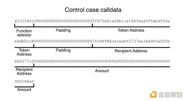现在我们的大部分数据是由调用数据中的两个地址组成的:一个是我们要转移的 Token 地址,另一个是转移的接收地址。