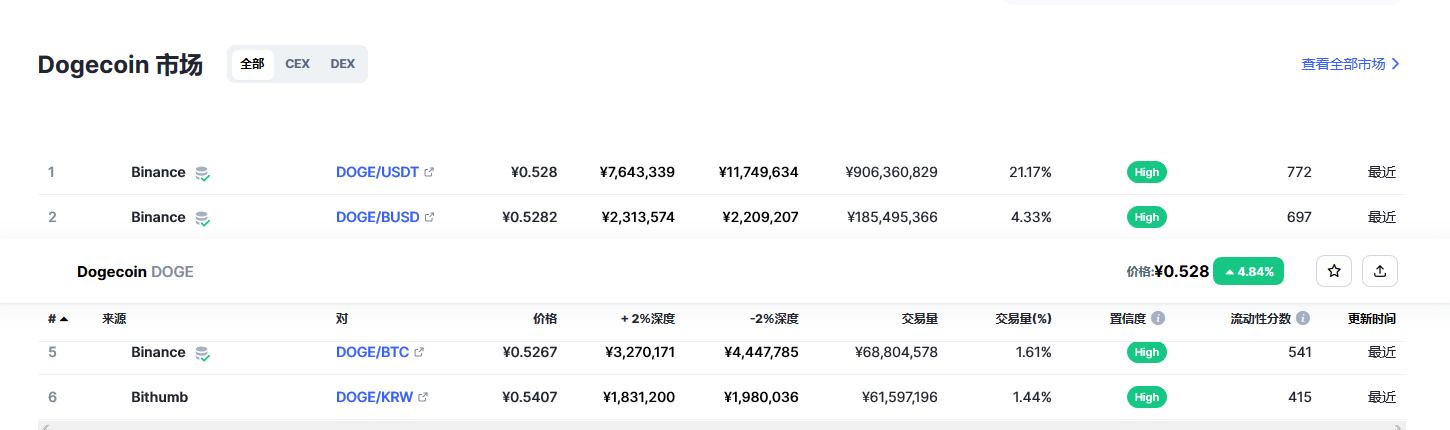 Dogecoin 今日价格 为 ¥0.528577 CNY,其 24 小时的交易量为 ¥4,280,500,782 CNY。Dogecoin 在过去 24 小时内增长了 5.15。 目前的 CoinMarketCap 排名为第 #8 位,其市值为 ¥70,126,738,568 CNY。 其流通供给量为 132,670,764,300 DOGE 个货币。