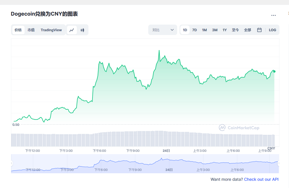 狗狗币价格今日行情价格为¥0.528元/枚。24H**¥0.54220000,24H量80.1亿24H,**¥0.51610000,24H额¥41.51亿,24H波幅 5.06%。
