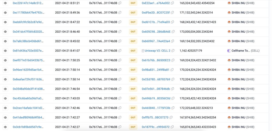 根据链上数据,我们发现这15个地址可能属于同一个人,因为他们在2021年4月21日从同一个地址“0x7617”收到了大量的SHIB。