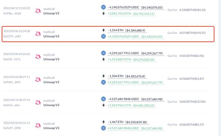 然后在2022年5月6日,这些地址以ETH的价格出售USDC。