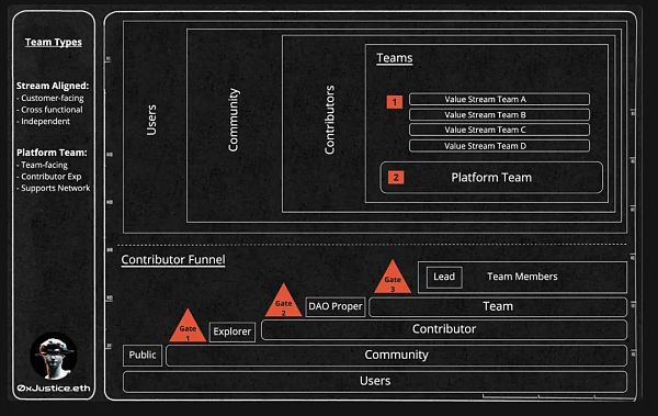 这些观察结果可能很有趣,但是如何将它们实施并应用于已经运行的 DAO上呢?好消息是,这并不是DAO所特有的挑战。有一个 Team Topologies的研究机构,还有一种称为 Inverse Conway Maneuver 的技术,我们都可以申请使用。