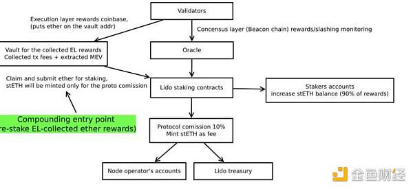 Lido 合约从资金库中撤回所有收集到的奖励,将其重新质押,并仅以协议费(10%)作为信标链(或共识层)奖励分发运行的一部分,mint 新的 stETH。