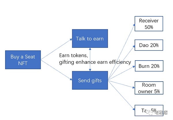 用6个座椅NFT燃烧出1个房间NFT,给持有座椅NFT的人提供房间赚币。对房间里发生的送礼行为,大概抽佣5%,躺赢。