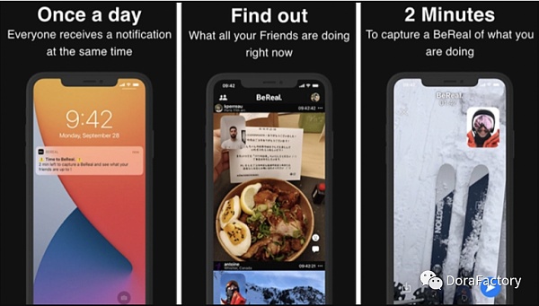 移动技术的进步使人们能够分享实时、即时的体验。Instagram 的社交照片共享应用程序于 2010 年在 iOS 上推出,几个月后 iPhone 4 为消费者提供了改进的相机。作为默认公众,它促成了品牌、模因和影响者的崛起。Snapchat (2011) 受益于先进的相机功能,为捕捉真实、不**瞬间的消失照片和视频提供动力。TikTok (2016) 通过增加手机屏幕尺寸和分辨率来利用全屏 UI。此外,该应用程序的内置录制和编辑功能使上传内容变得容易,而算法对内容的优先级为创作者提供了在没有大量追随者的情况下快速传播可能性。BeReal (2020) 利用 2016 年**在 iPhone 7 Plus 中引入的双摄像头功能来建立更亲密、更真实的社交联系。