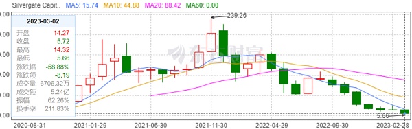 截止今日(3月3日)上午10点,Silvergate 的股价已大幅下跌 58.7% 至 5.57 美元。该股自 2021 年 11 月 30 日 239.36 美元的历史**点 (ATH) 以来下跌了 97% 以上。