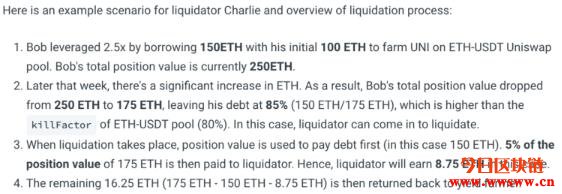 对于债务价值高于用户持仓价值“killFactor”函数标准的用户持仓,清算人可以对这些风险过高的持仓进行清算,清算人可以获得持仓价值的5%作为回报。