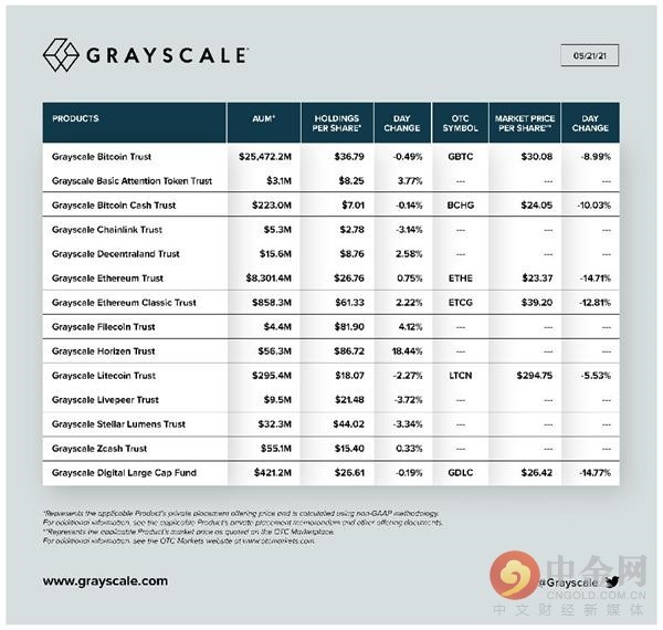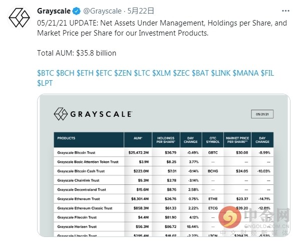 新闻:根据灰度官方推特公布的数据,截至美国东部时间5月21日,灰度总资产管理规模为358亿美元。比特币信托基金(GBTC)成交价为每只30.08美元,较前一日下跌8.99%;以太坊信托(Ethe)交易价格为每股23.37美元,较前一日下跌14.71%。
