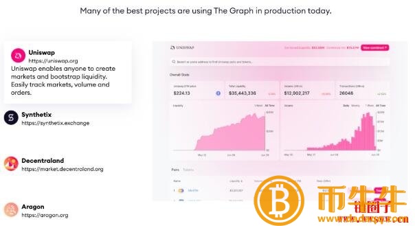 Graph目前的项目计划是建立区块链生态系统所需的基础设施。虽然区块链仍处于行业的初级阶段,对这类项目的需求并不那么明显,但事实上,索引协议正逐步显示出其重要性。很多建立在区块链上的DAPP,为了及时反映当前的市场情况,通过图的索引将数据快速导入DAPP,比如Uniswap、Synthetix等等。
