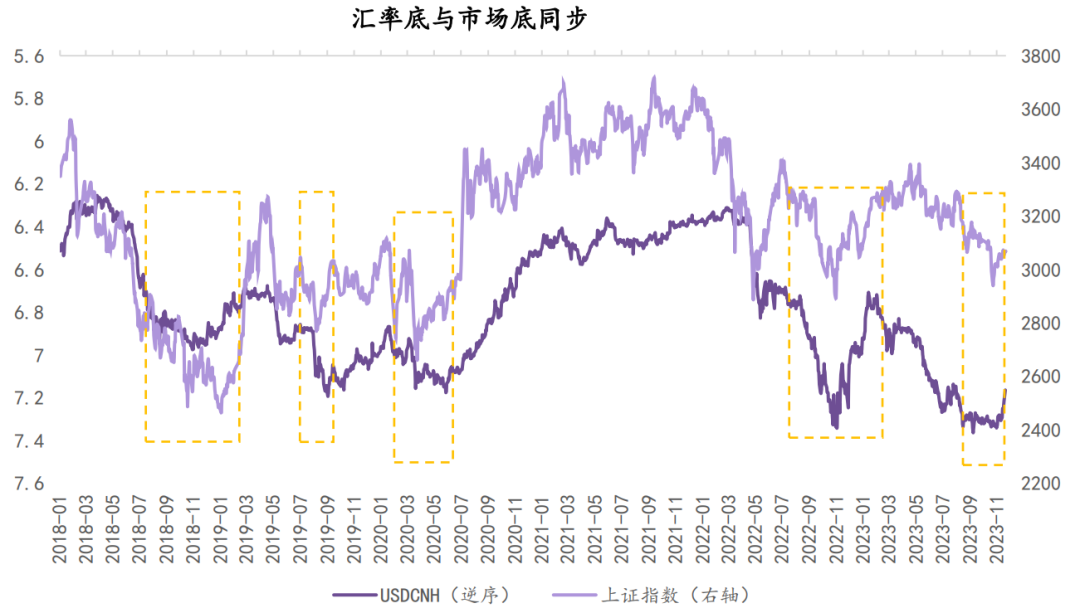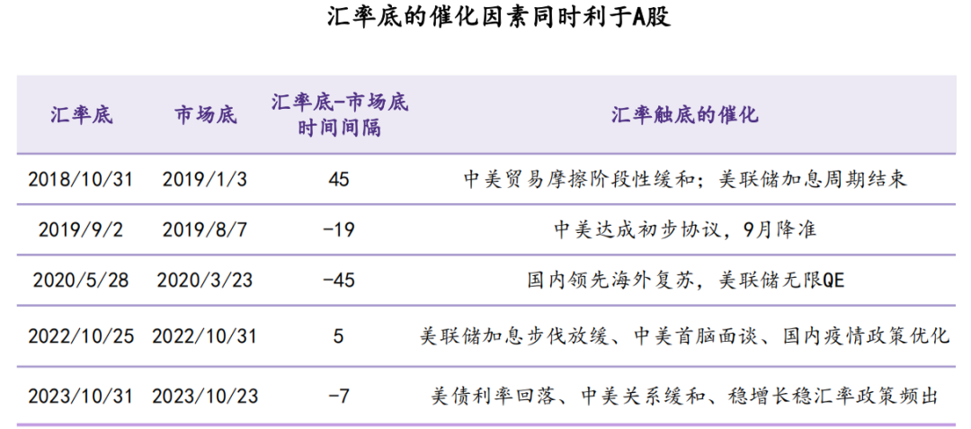 并且由于共因关系,汇率底与A股市场底较为接近,人民币止贬企稳的条件同时作用于股市估值修复。