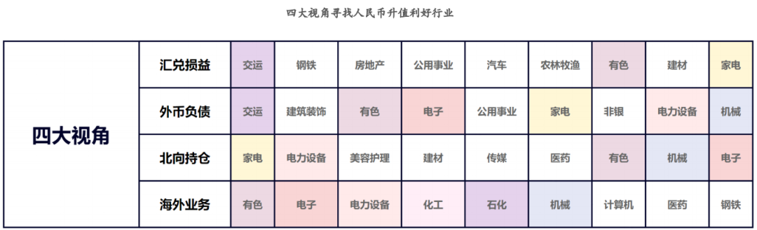 华鑫证券综合汇兑损益、外币负债、北向持仓和原材料进口四大视角,认为交运、有色、石化、机械、家电、电子、电力设备等行业有望受益于人民币汇率升值。