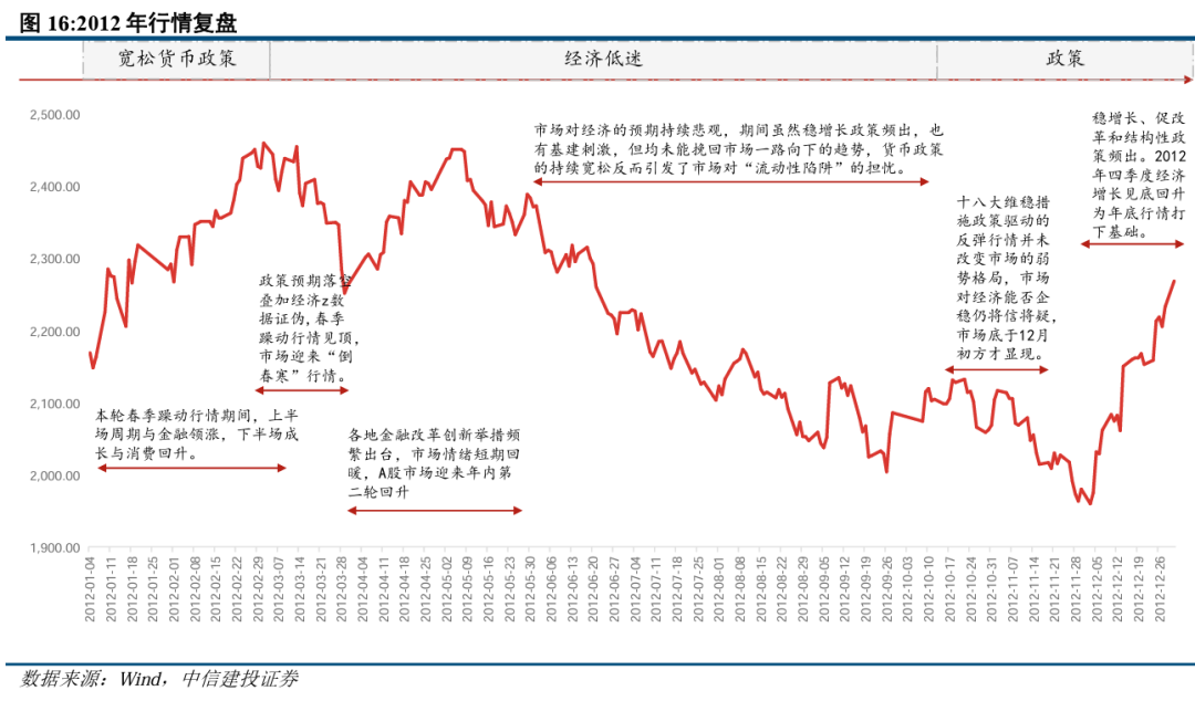 2011年,市场在通胀高企、经济增速下滑的忧虑中走弱。延续到2012年市场对经济的预期持续悲观,期间虽然稳增长政策频出,也有基建**,但市场依然震荡下行。**维稳措施虽然让市场有**起色,但市场对于经济能否企稳仍将信将疑,出现了反复的“拉扯”,**,在12月初,市场开始回暖。