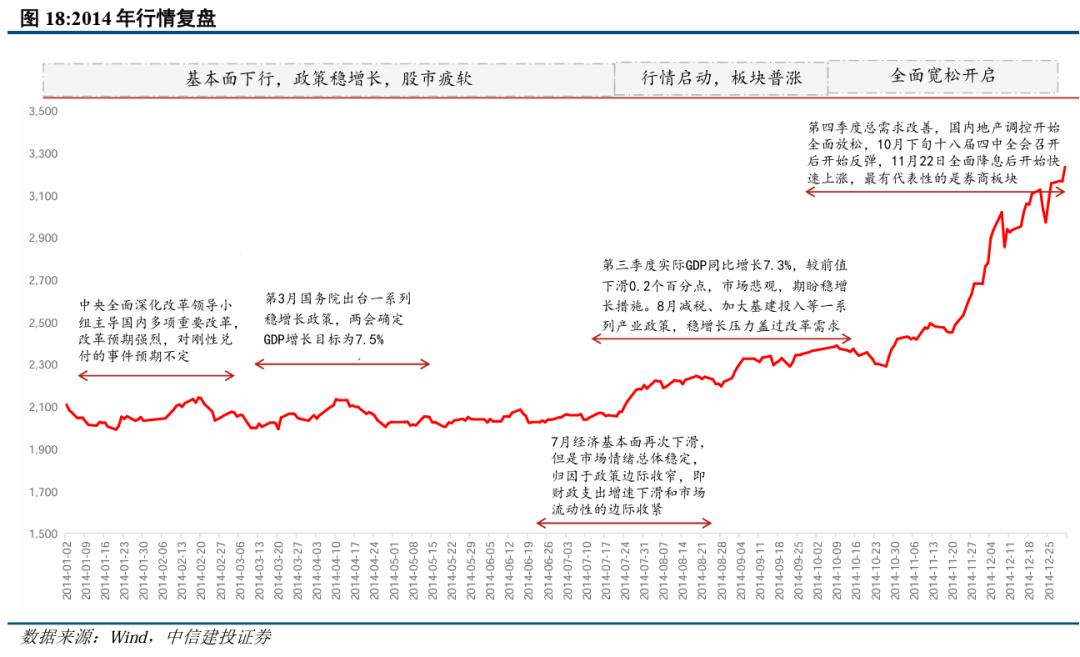2013年,遭遇了乌龙指、钱荒、债市风暴等多起风险事件,上证综指全年下跌7%(数据来源:wind),年中出现大幅下挫。2014年,由于13年“钱荒”负面影响持续存在,市场对流动性预期较低,同时基本面持续冷淡,CPI和PPI数据无法支撑,市场投资情绪也比较谨慎。直到11月**降息之后市场情绪开始回暖,并在年末形成翘**情。