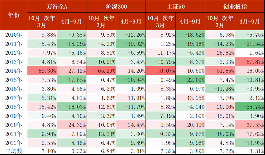通过对比2010年以来,每年的10月至次年3月以及该年度4-9月主要宽基指数的涨跌幅情况,不难发现:跨年行情确实存在且较为显著。