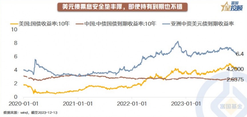 10年期美债和亚洲中资美元债的到期收益率虽然已自高位回落,但分别仍有4.2%、6.4%,相比10年期中债2.6%的到期收益率,简单的持有至到期策略即可获得较高的票息回报。