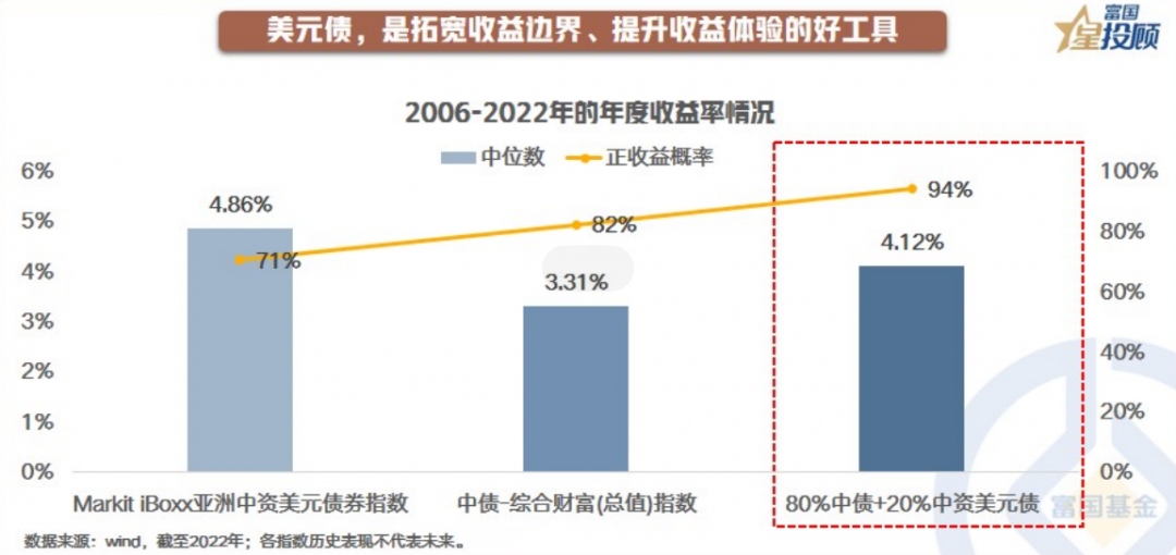 2006-2022年间,中债综合财富指数的年度收益率中位数为3.31%,正收益率概率为82%。若是加入**的中资美元债配置,如“80%中债 20%中资美元债”的组合,其年度收益率中位数提升至4.12%,正收益概率更是提升至94%。