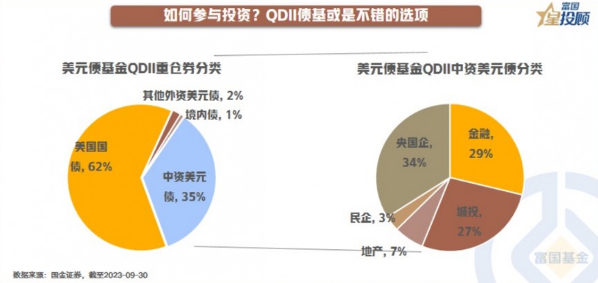 对于**投资者而言,投资美元债最直接和简单的方式就是通过QDII债券型基金参与。根据wind统计,其重仓券种中,62%是美国国债、35%是中资美元债,这两部分构成合计就已有97%。